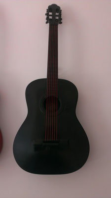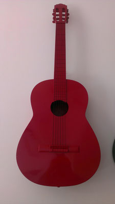 gefunden. Gebrochener Hals, 5 Euro. Ich habe sie rot lackiert, die Saiten schwarz. Gefiel mir als Deko. Der Plan für das Gegenstück war schnell gefasst und so entstand dieses Paar.